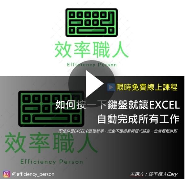 本課程初衷旨在提供學員有關EXCEL的知識與技能培訓,我們致力於確保課程內容的準確性及實用性,然而學員在實際工作中的應用效果可能因參與程度或外部因素而有所不同。正如法律規定,我們無法保證學員參加本課程後定能獲得特定的職業成果,例如升職、薪資提升、不用加班或其他職場相關利益。課程提供的資訊與工具應被視為協助職業發展的資源,而非達成特定職業目標的保證。本頁面或我們任何網站、電子郵件、影片中的任何內容均不構成對未來收益的承諾或保證。我們任何網站或電子郵件中引用的任何數據及資料僅只是根據過去的結果所做的估算或預測,不應被視為確切的收益數據。如果您有任何疑問,請發送電子郵件至agary79205@efficiencyperson.com
